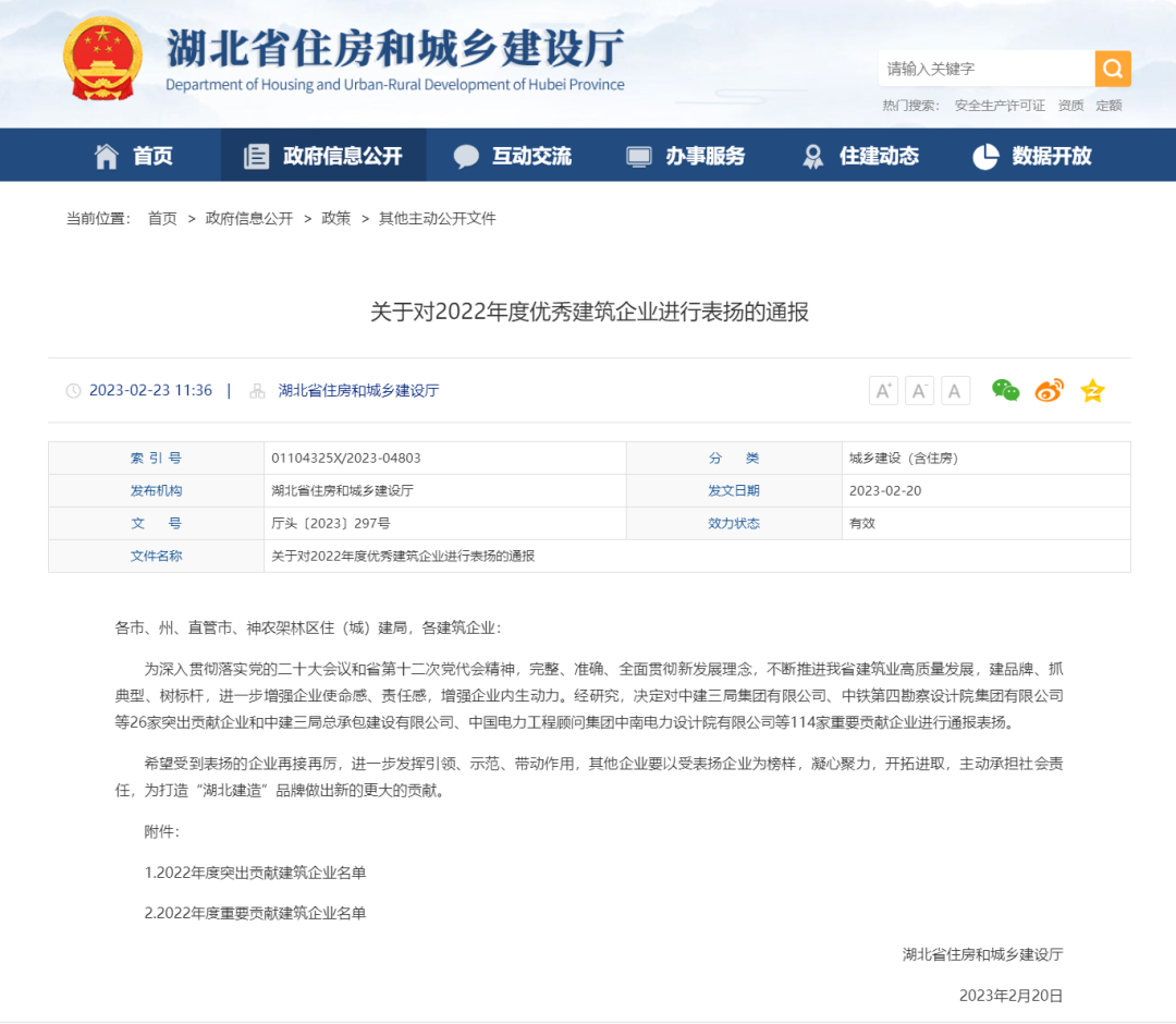 2023年2月23日,湖北省住房和城乡建设厅官网发布《关于对2022年度优秀建筑企业进行表扬的通报》(厅头〔2023 〕297号),公司继上年度获评湖北省“重要贡献建筑企业”后,再次荣列榜单。