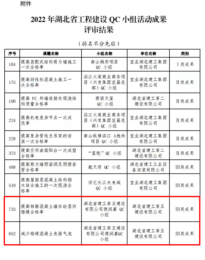 湖北省建设工程质量安全协会公布2022年湖北省工程建设QC小组活动成果评审结果,公司德润嘉项目《提高钢筋混凝土墙体砼层间错缝合格率》、《减少铝模混凝土表面气泡》荣获Ⅲ类成果。