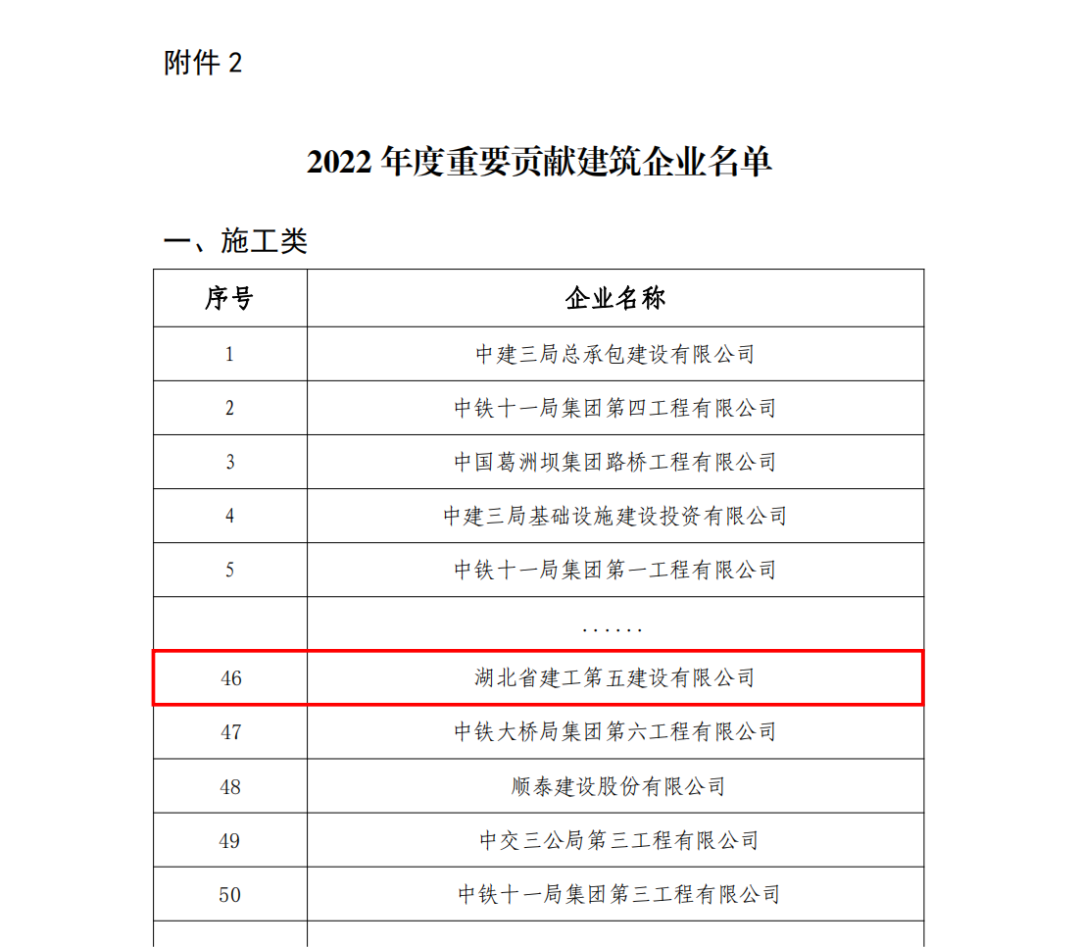 2023年2月23日,湖北省住房和城乡建设厅官网发布《关于对2022年度优秀建筑企业进行表扬的通报》(厅头〔2023 〕297号),公司继上年度获评湖北省“重要贡献建筑企业”后,再次荣列榜单。