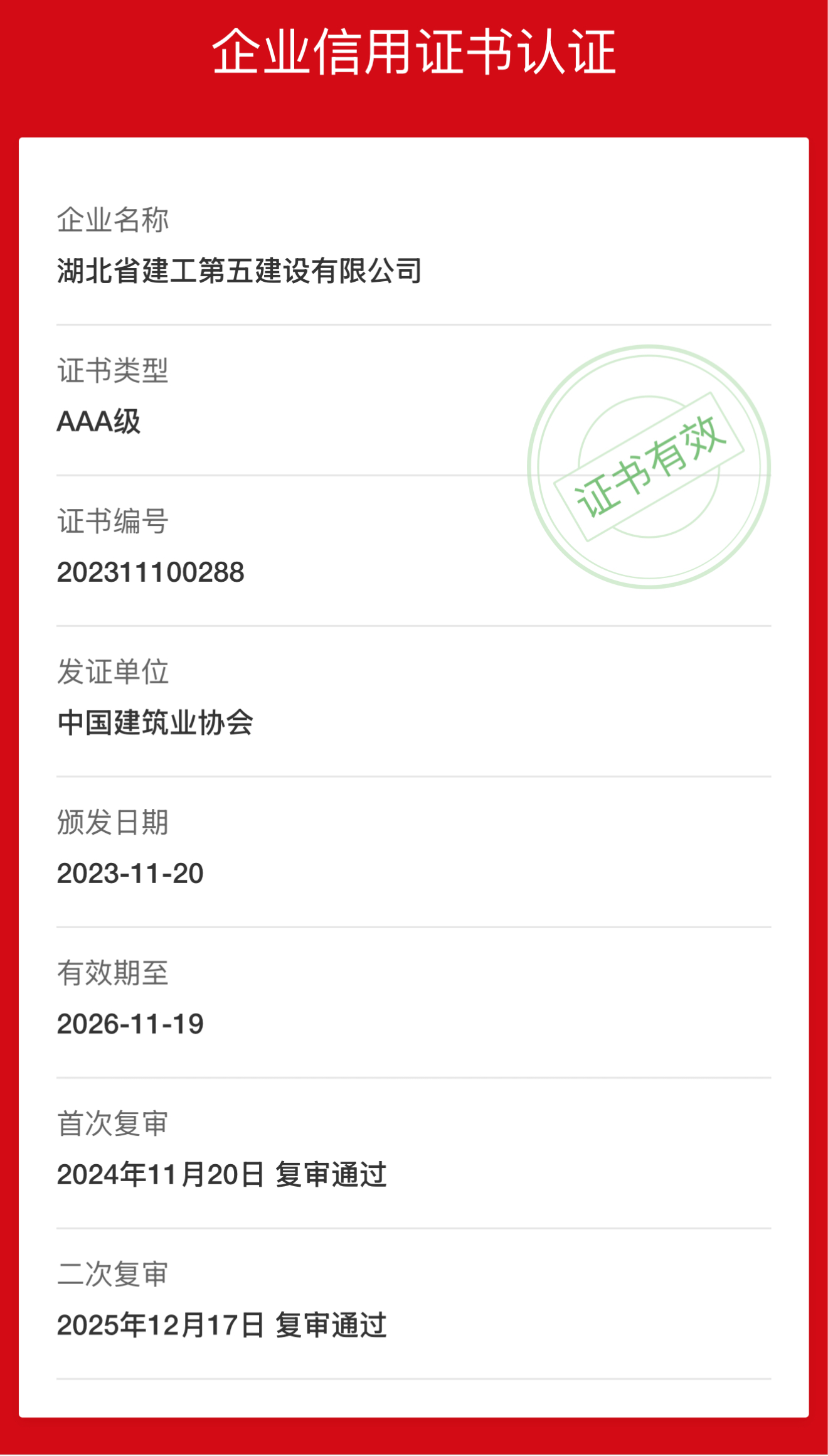 中国建筑业协会、湖北省建筑业协会同步公布2025年度信用评审结果,公司高标准通过AAA级信用年审,稳居全国行业信用第一梯队。