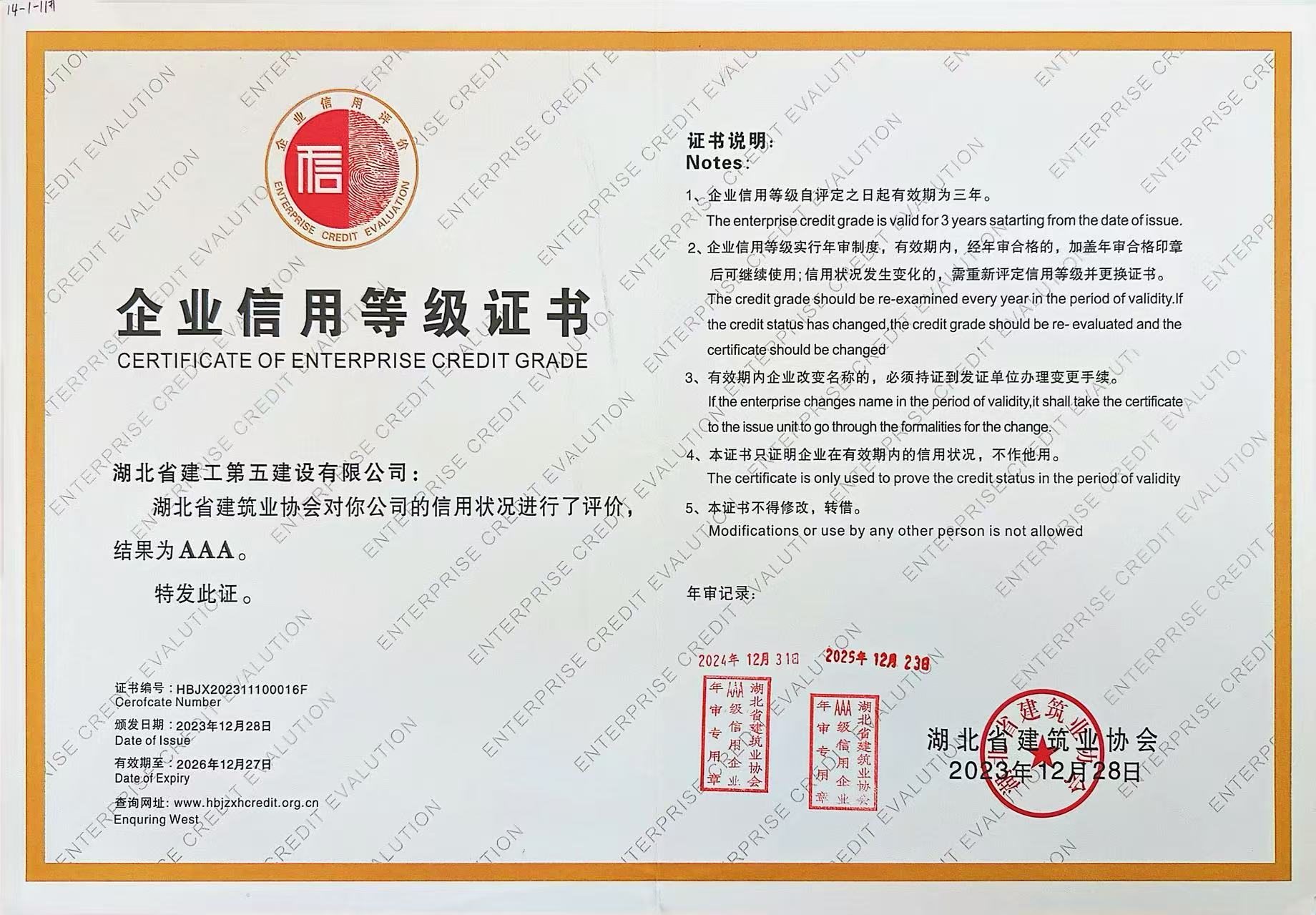 湖北省建工第五建设有限公司荣膺省级“工程建设诚信典型企业” 获得AAA级信用企业全域认证