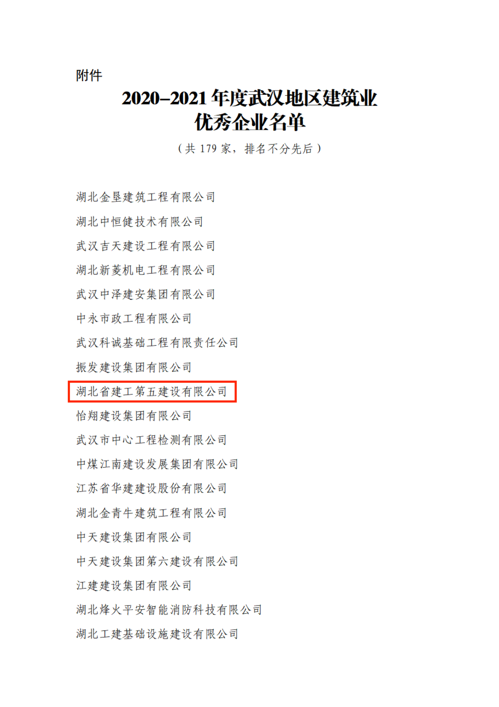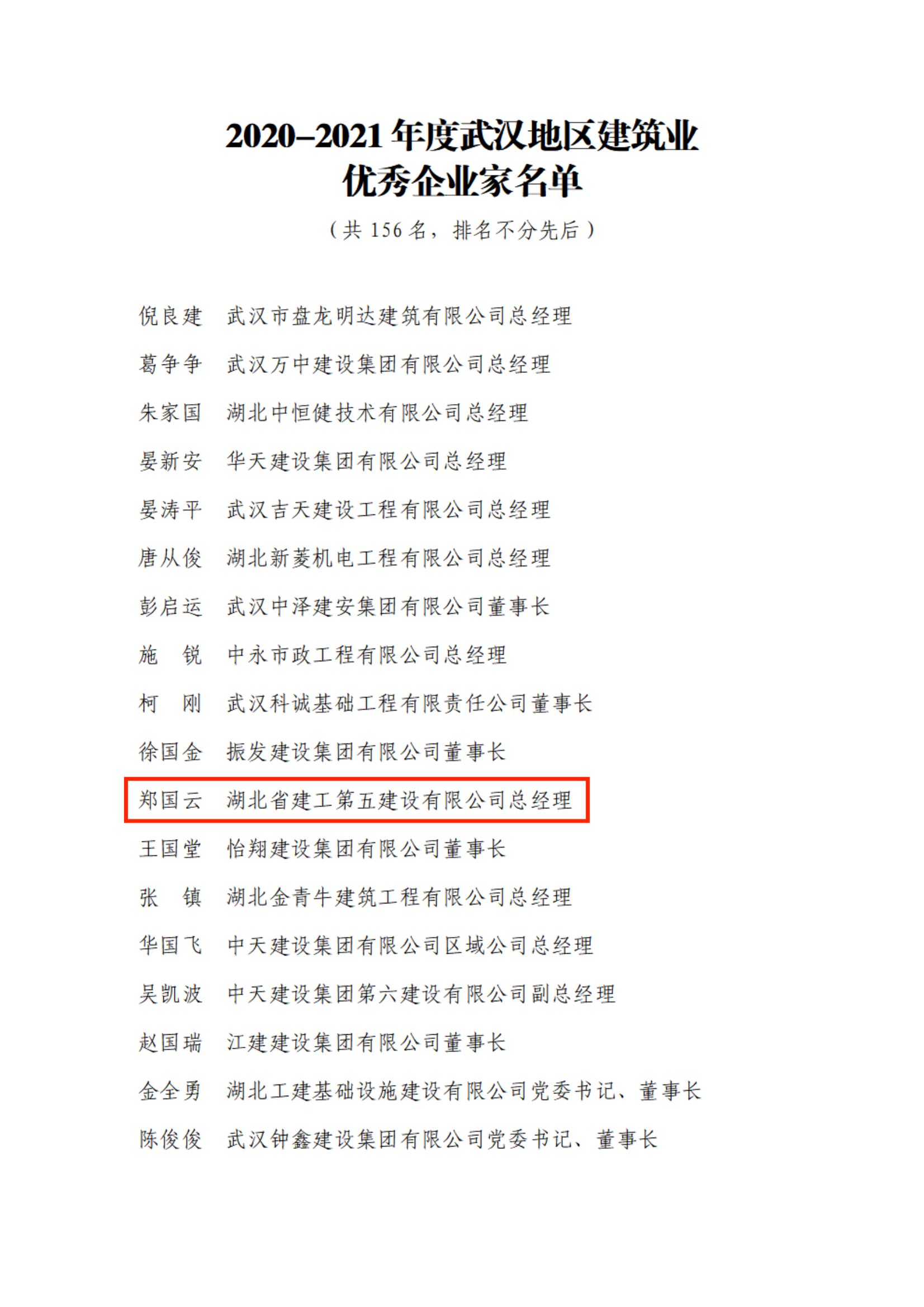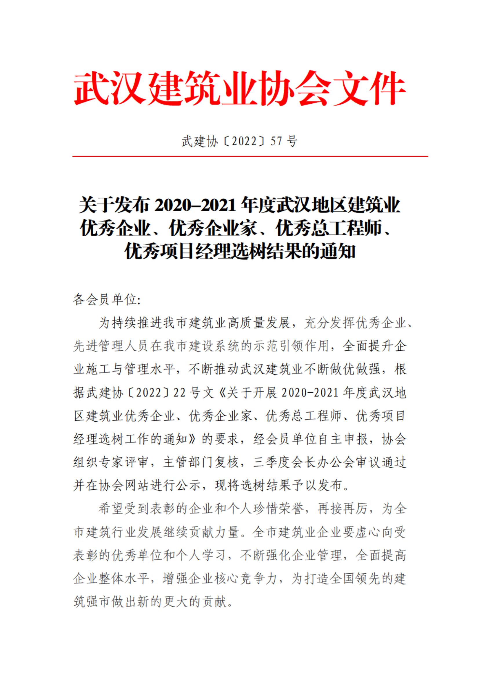 2022年11月,武汉建筑业协会发布2020-2021年度武汉地区建筑业“四优”(优秀企业、优秀企业家、优秀总工程师、优秀项目经理)选树结果。公司连续8届荣登优秀企业榜单,公司总经理郑国云获评优秀企业家,公司总工程师王建军获评优秀总工程师,刘晟杰、唐圣、杨久林、谢平贵、贺小禹、胡钢等6名同志获评优秀项目经理。