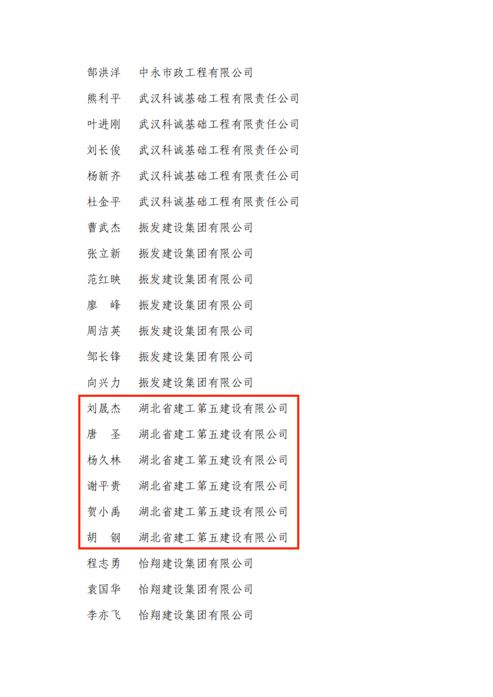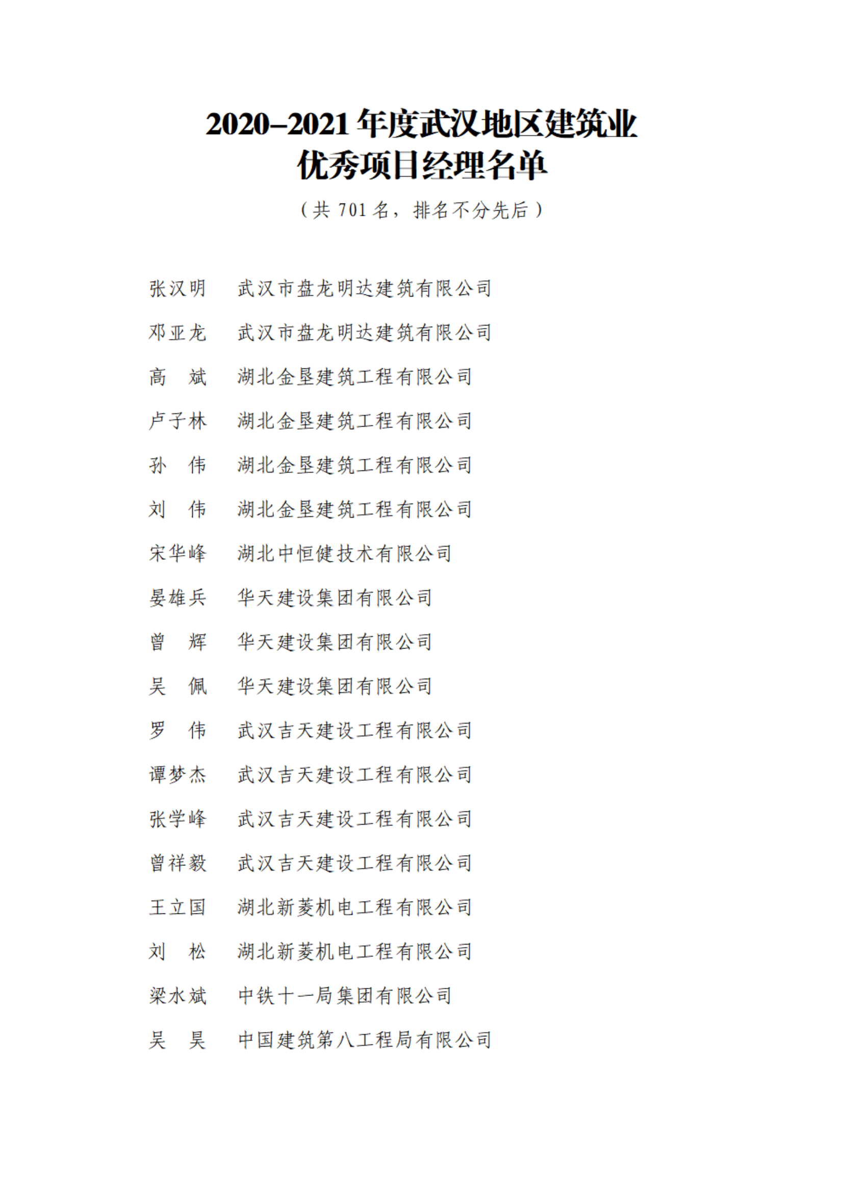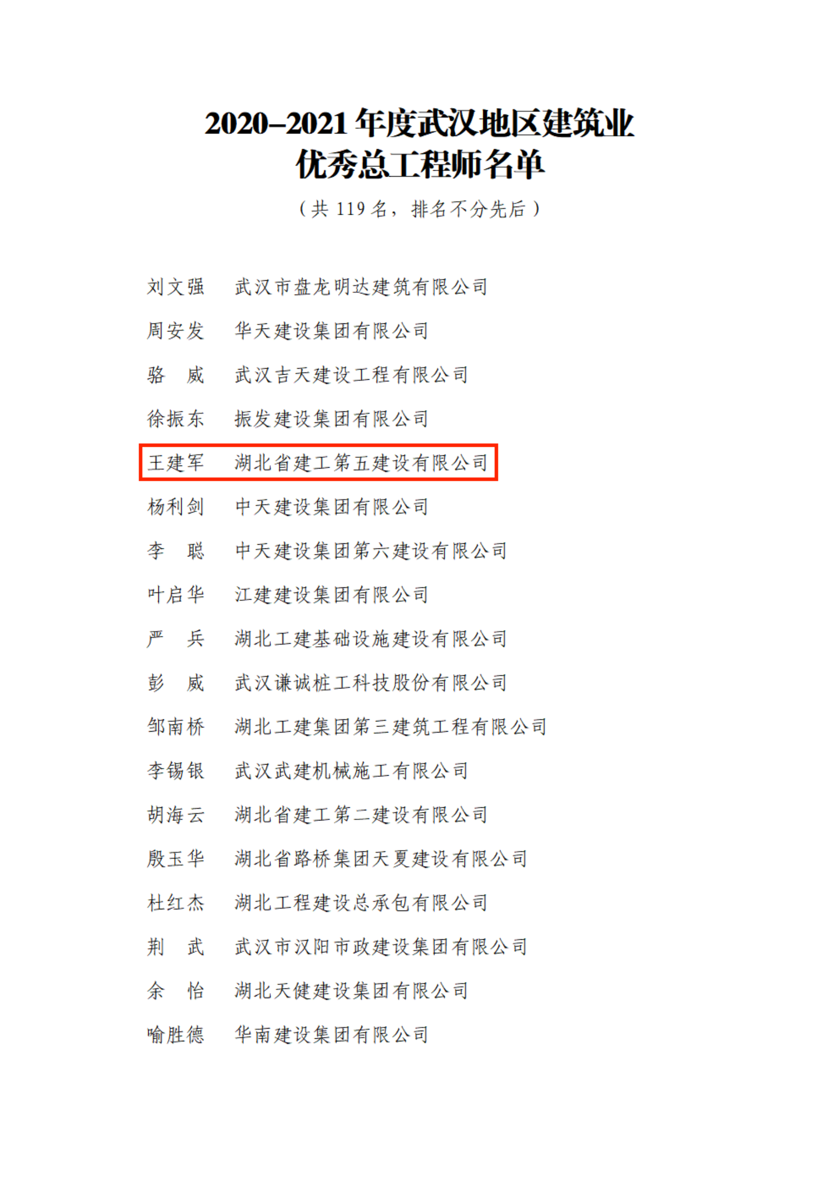 2022年11月,武汉建筑业协会发布2020-2021年度武汉地区建筑业“四优”(优秀企业、优秀企业家、优秀总工程师、优秀项目经理)选树结果。公司连续8届荣登优秀企业榜单,公司总经理郑国云获评优秀企业家,公司总工程师王建军获评优秀总工程师,刘晟杰、唐圣、杨久林、谢平贵、贺小禹、胡钢等6名同志获评优秀项目经理。