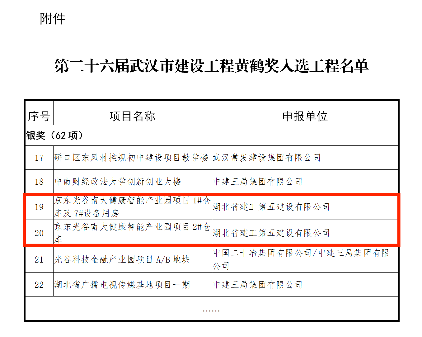 武汉建筑业协会公布2024年度武汉市建设工程黄鹤奖入选工程名单。经企业自愿申报、质量管理工作委员会资料审查、专家现场核查、评审委员会审定、会长办公会审议、报主管部门审核,并经协会官网公示,公司承建的京东光谷南大健康智能产业园项目1#仓库及7#设备用房、2#仓库分别斩获黄鹤奖银奖。