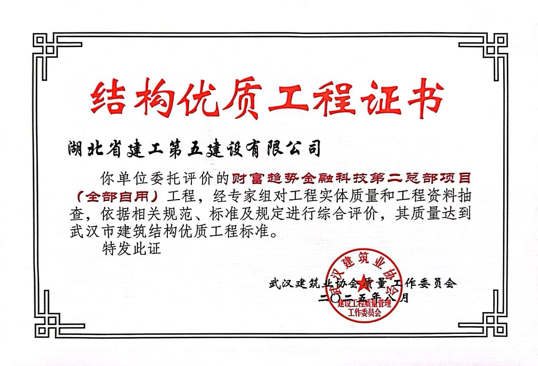 经武汉建筑业协会质量工作位委员会评定及公布,公司承建的财富趋势金融科技第二总部项目,被评为武汉市建筑结构优质工程。该项目曾获评2024年上半年武汉市建筑施工安全生产标准化学习交流工地(安全黄鹤奖)。