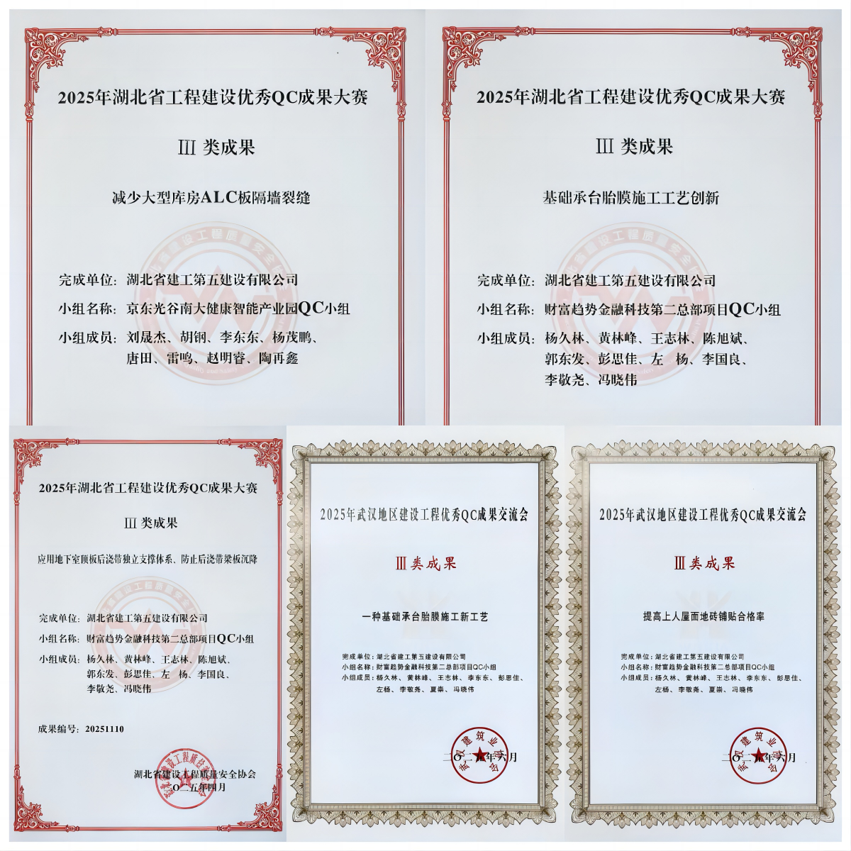 湖北省建设工程质量安全协会、武汉建筑业协会相继公布2025年工程建设优秀QC成果榜单。公司承建的京东光谷南大健康智能产业园项目申报的《减少大型库房ALC板隔墙裂缝》,财富趋势金融科技第二总部项目申报的《基础承台胎膜施工工艺创新》《应用地下室顶板后浇带独立支撑体系、防止后浇带梁板沉降》《提高上人屋面地砖铺贴合格率》《一种基础承台胎膜施工新工艺》,荣获湖北省、武汉市2025年工程建设优秀QC成果共计5项。