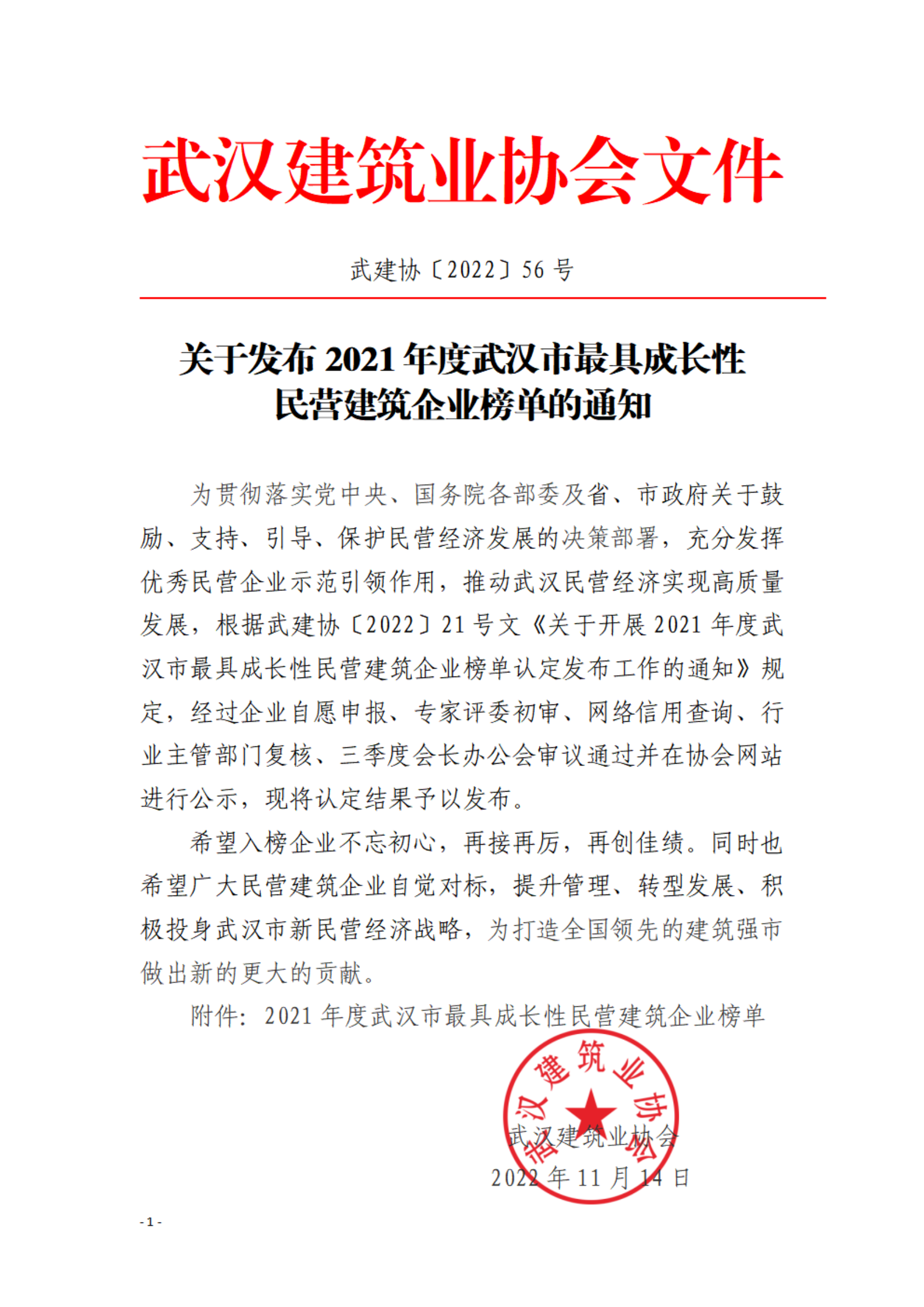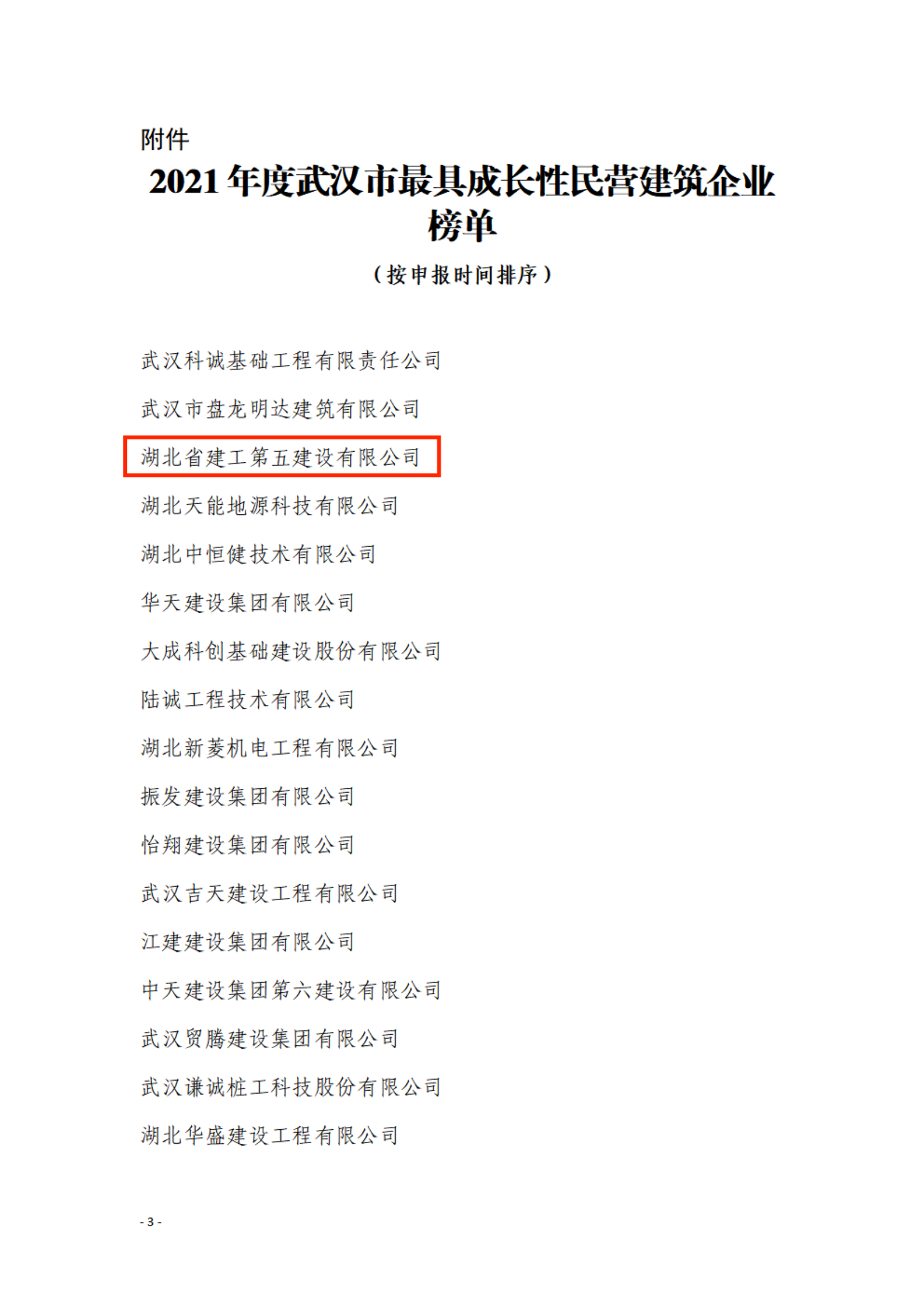2022年11月,武汉建筑业协会发布2021年度武汉市最具成长性民营建筑企业榜单。经过企业自愿申报、专家评委初审、网络信用查询、行业主管部门复核、武汉建协2022年三季度会长办公会审议通过并在协会网站进行公示,68家建筑企业获评“2021年度武汉市最具成长性民营建筑企业”,公司连续3年光荣上榜。